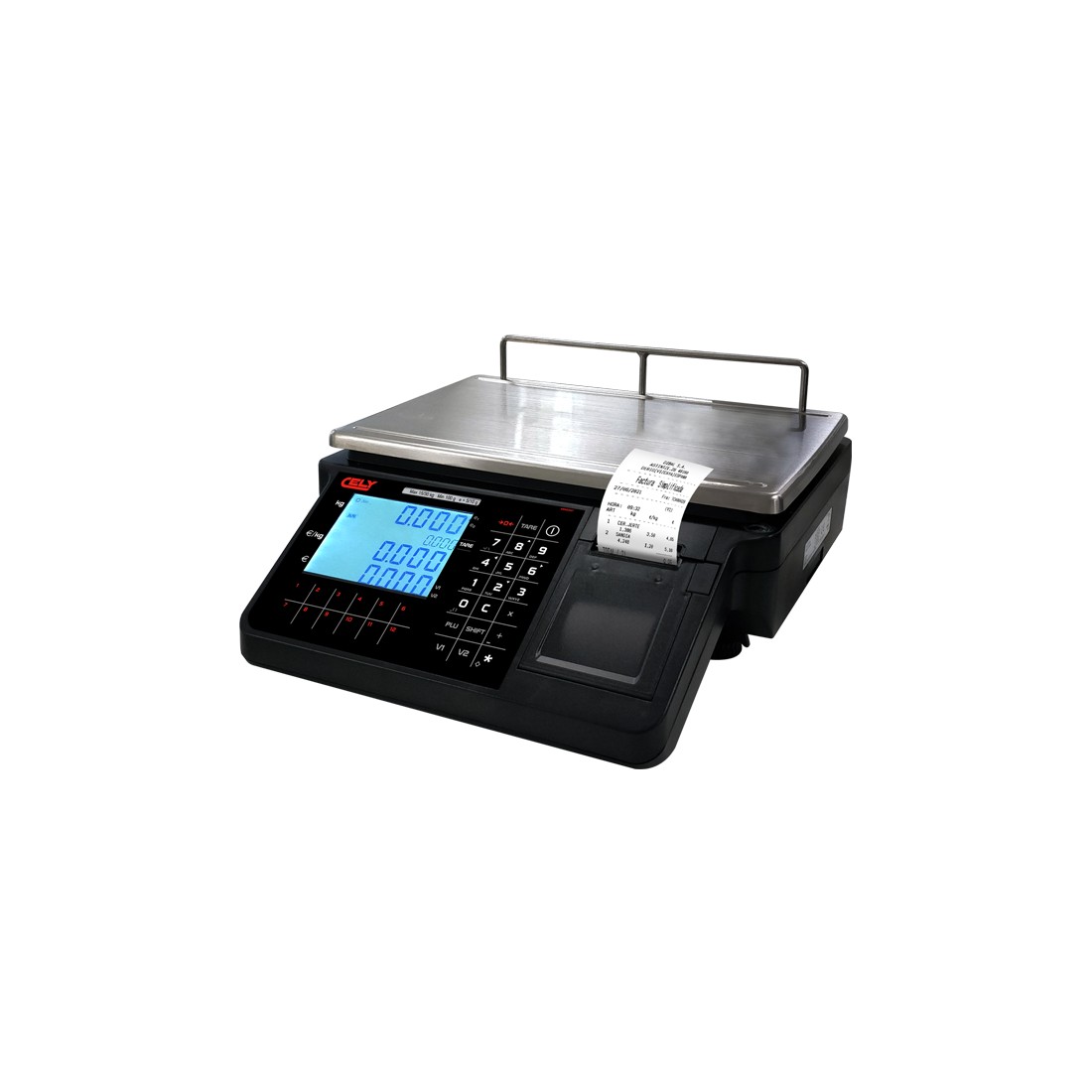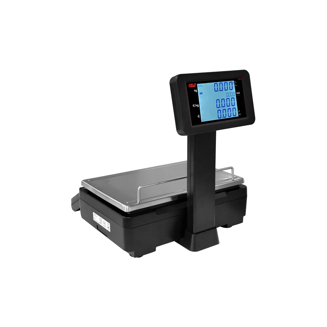 Balanza electrónica peso-precio-importe con impresora de tickets. Válida para metrologia legal. 2 vendedores. Plano y torre en la misma balanza, la torre está incluida en el embalaje y es fácilmente instalable. Adaptador AC 12V / 2.500 mA