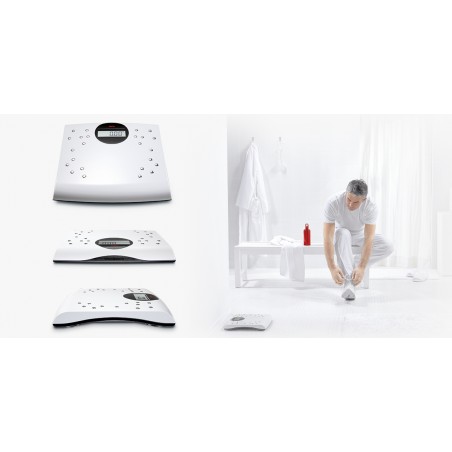 Báscula digital con 24 electrodos cromados y función BF/BW. Un extraordinario número de electrodos cromados indica lo que es capaz de hacer esta báscula: además del peso, mide el contenido de grasa y de agua corporal y comprueba automáticamente el BMI. Y sabe cómo reconocer automáticamente a cada uno de sus usuarios, una vez que hayan introducido la edad, el sexo, la talla y el estado de forma.